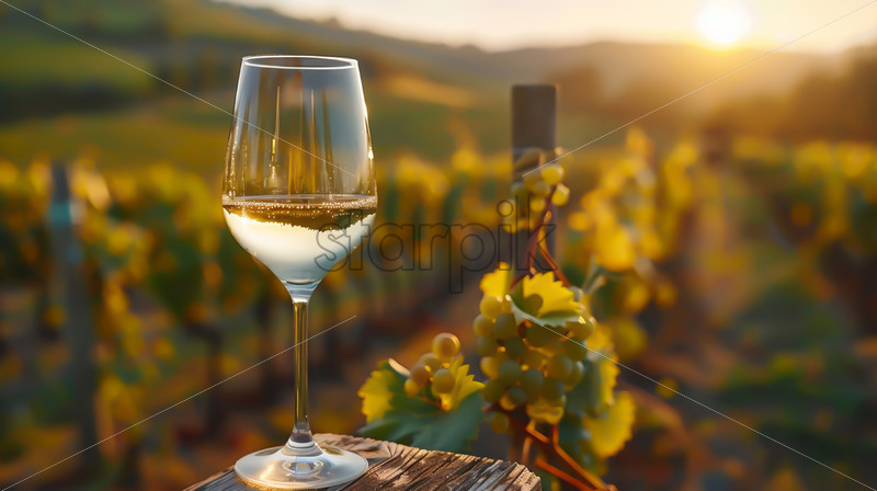 A glass of white wine on the background of a vineyard
