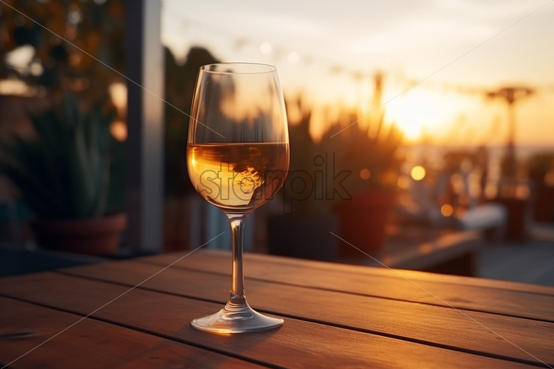 A glass of wine on a wooden table at a terrace