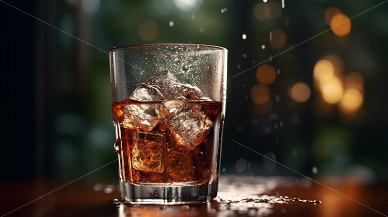 Bartender pouring whiskey cocktail into a glass with big cube of ice from a shaker mixer