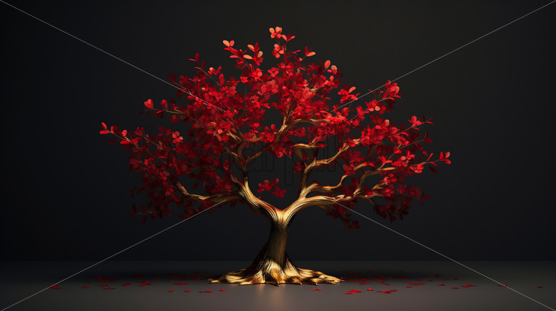 A golden tree with royal red flowers