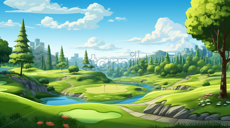 A golf course created in the style of cartoons