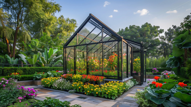 A greenhouse with plants in the garden