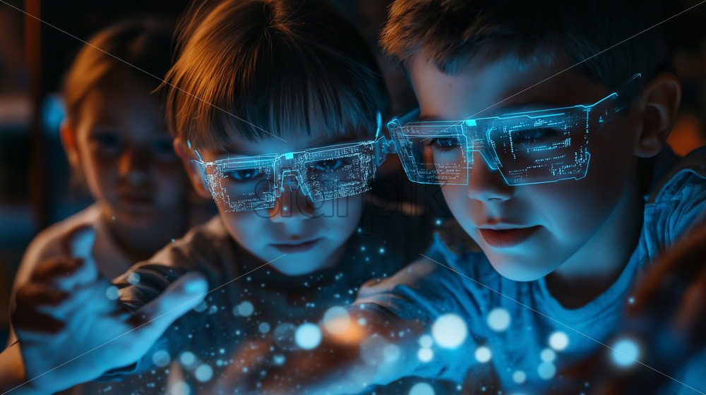 Home » Shop » AI Illustration » A group of children participating in a quantum-based educational game, using wearable devices to manipulate holographic qubits