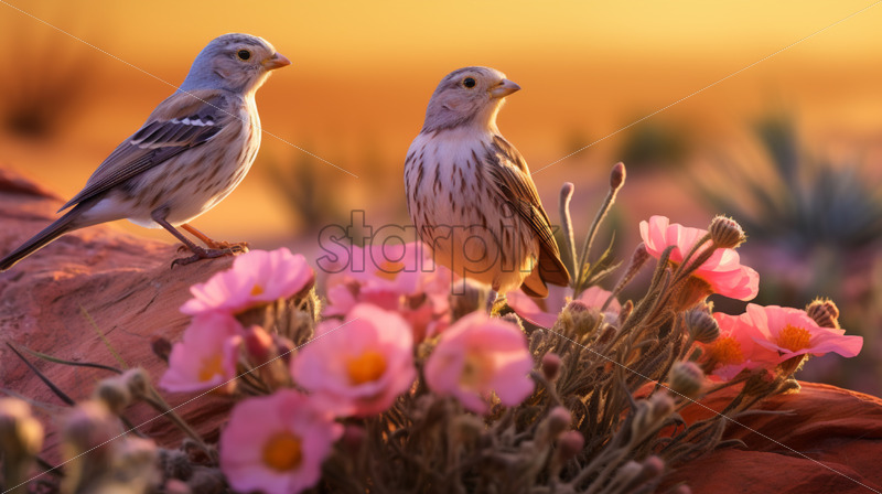 Home » Shop » Uncategorised » A group of Desert finches in vibrant plumage, fluttering among desert blooms