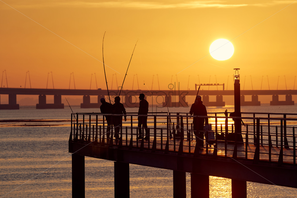 A group of fishermen relaxing on the pier with the Ponte Vasco da Gama bridge rising above the surface of the water in Lisbon Portugal and a impressive sun setting over the horizon in the background