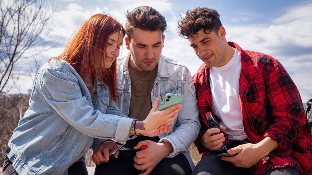 Home » Shop » photo » A group of friends resting and taking selfie outside. Bare trees. Friendship