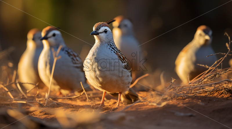 A group of Gambel’s quail foraging for food in the sandy desert soil
