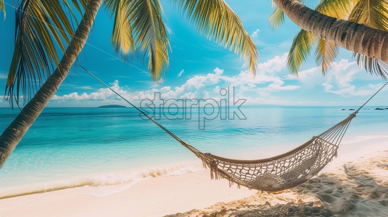 A vibrant beach scene with palm trees, hammock
