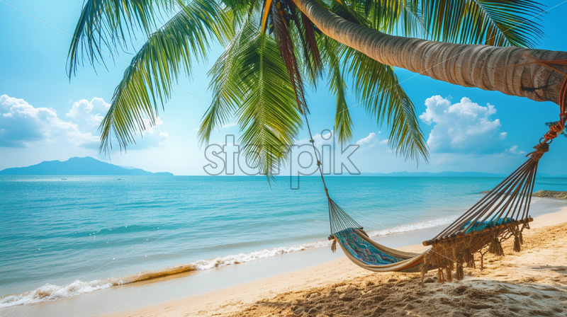 Home » Shop » Uncategorised » A hammock hanging from some palm trees on the beach