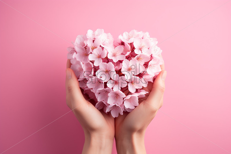 A hand holding heart-shaped flowers on a pastel background