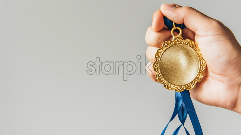 A hand holds a gold medal on a white background