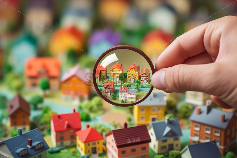 Home » Shop » AI Illustration » A hand holds a magnifying glass that magnifies a background full of models of small houses.