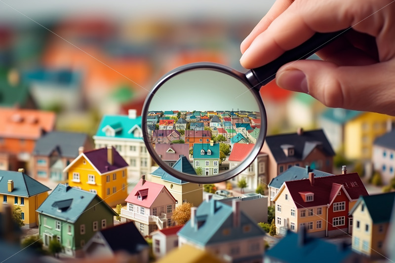 A hand holds a magnifying glass that magnifies a background full of models of small houses.