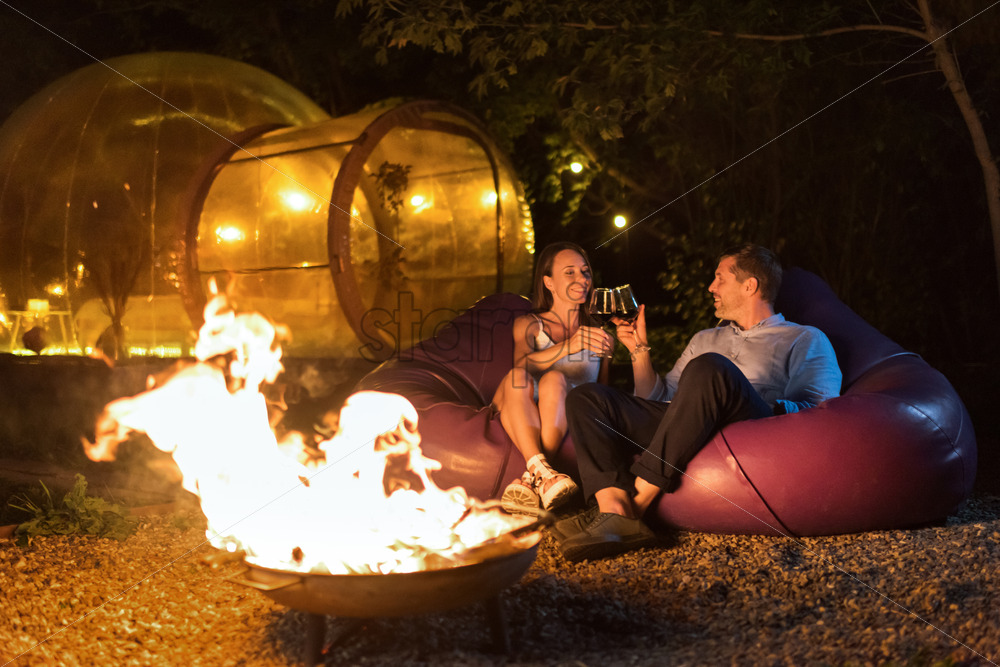 A happy couple drinking wine near a fireplace at night. Transparent bubble tent on the background at glamping