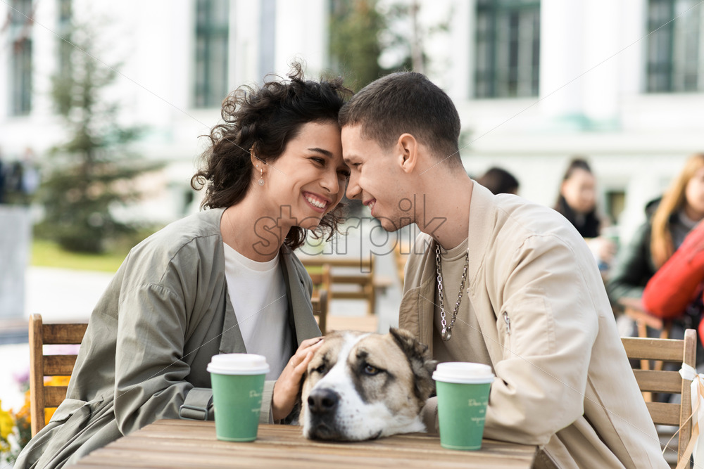 A happy couple outdoors near a cafe. Smiling, petting their dog, coffee on the table. Autumn atmosphere