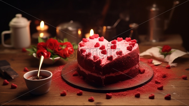 Pink cake composition with cat. Number three in it, tapes and shiny silver background