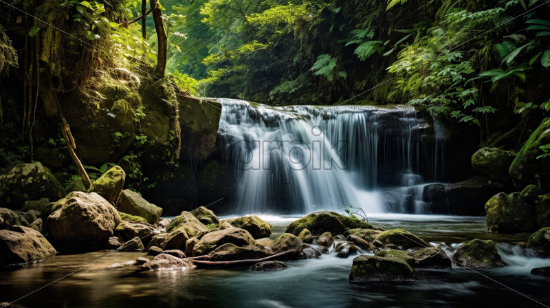 A hidden waterfall cascading down the rocks amidst the dense foliage