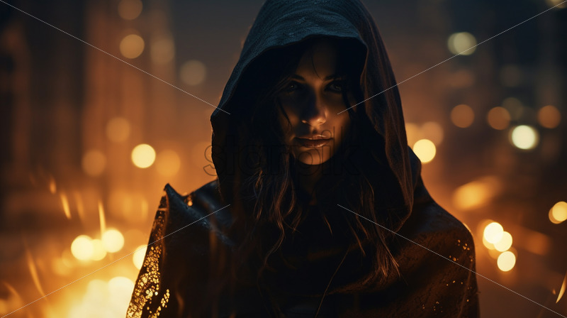 Close-up shot of a young caucasian girl with curly long dark brown hair and bangs. Freckles on the face. Expressing tenderness. Isolated background