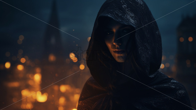 Close-up shot of a young caucasian girl with curly long dark brown hair and bangs. Freckles on the face. Expressing tenderness. Isolated background