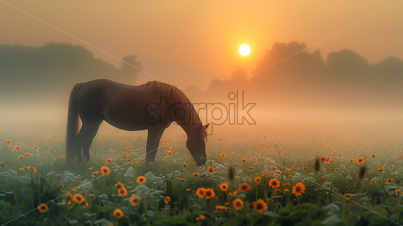 Home » Shop » Uncategorised » A horse grazing on a field early in the morning