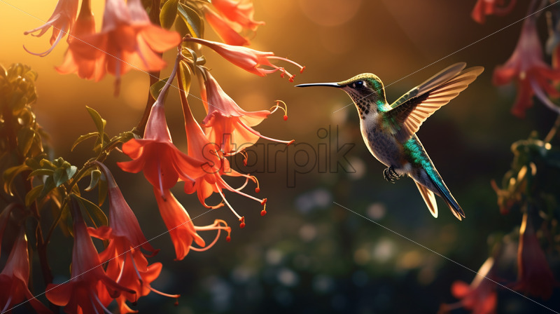 A hummingbird collects nectar from flowers