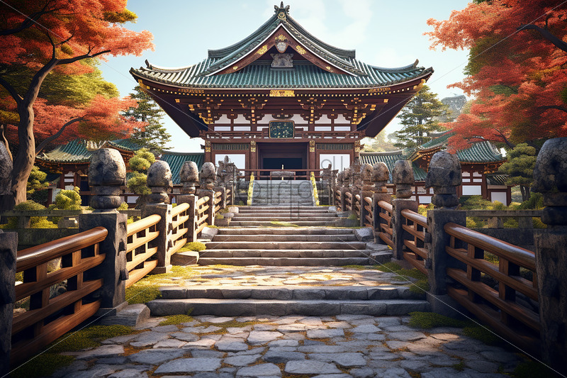 A watercolor illustration in Asian style, with mountains, pagodas, trees