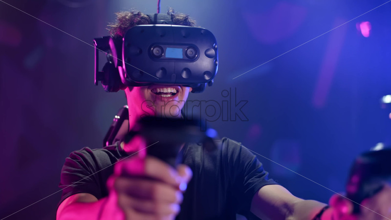 A joyful, interested boy is playing on VR treadmill with helmet, controllers and a backpack. Other people playing nearby, virtual reality
