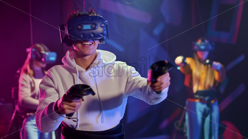 A joyful, interested girl is playing on VR treadmill with helmet and controllers. Other people playing nearby. Slow motion, virtual reality