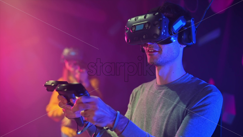 A joyful, interested man is playing on VR treadmill with helmet and controllers. Other people playing nearby. Slow motion virtual reality