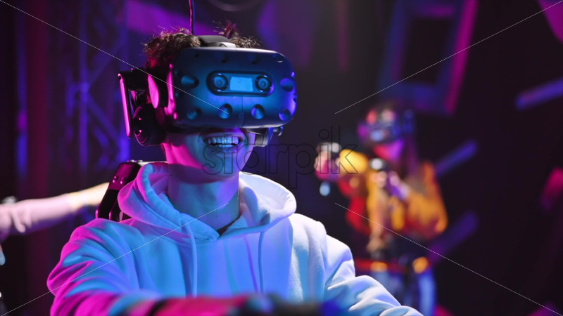 A joyful, shocked boy is playing on VR treadmill with helmet, controllers and a backpack. Other people playing nearby. Slow motion virtual reality