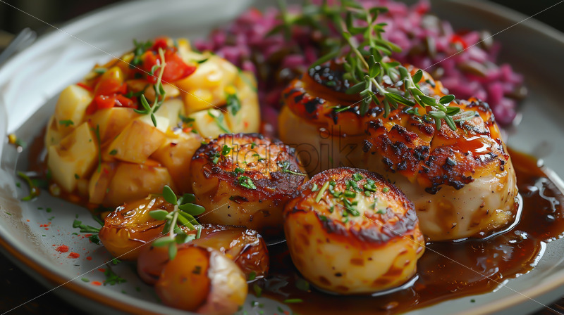 Close up of a gourmet dish featuring grilled steak topped with foie gras, served with sauteed spinach and a rosemary garnish Royalty Free Stock Video Footage