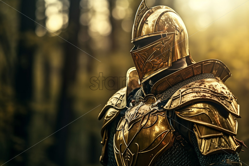 A knight in golden armor against the background of a forest