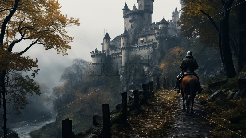 Home » Shop » Uncategorised » A knight riding towards a castle in the mountains