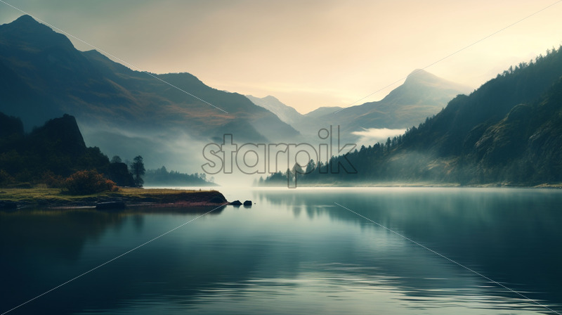 Daylight misty view to Oasa dam lake with mountains full of green trees and monastery on background. Bright clear sky. Image reflecting on water. Negative copy space, place for text. Sebes, Romania Royalty Free Stock photo