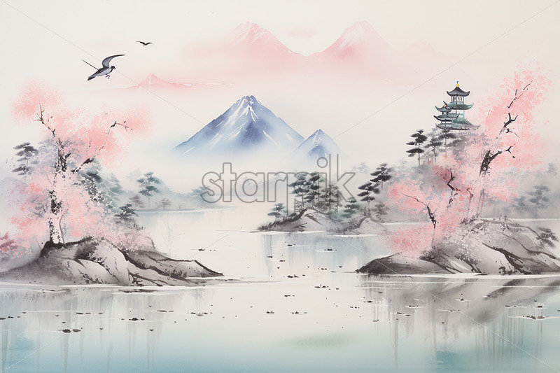 A watercolor illustration in Asian style, with mountains, pagodas, trees