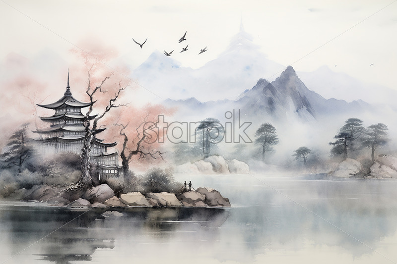 A watercolor illustration in Asian style, with mountains, pagodas, trees