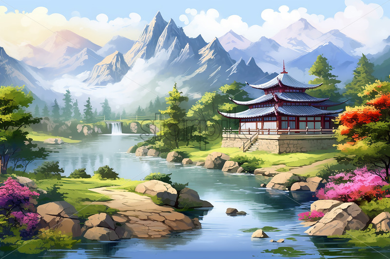 A watercolor illustration in Asian style, with mountains, pagodas, trees