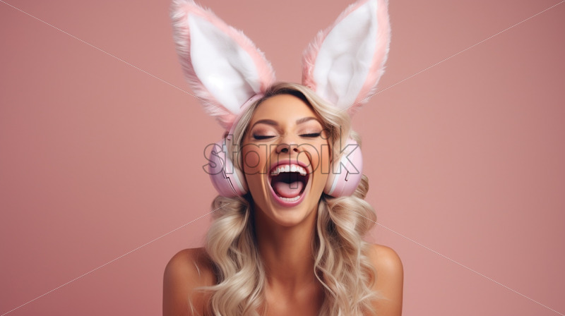 Happy woman listening to music on wireless headphones connected to mobile phone, on the streets at sunset Royalty Free Stock photo