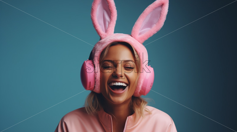 A laughing girl wearing headphones with rabbit ears