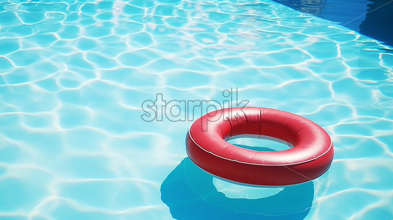 A lively pool party scene with vibrant inflatables, upbeat music, and guests enjoying the sun