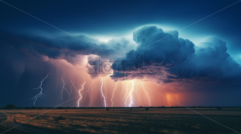 Generative AI an agricultural field and there are black clouds and lightning in the sky