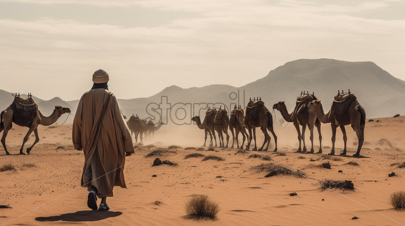 Nomadic tribes setting up colorful tents in the midst of endless sand dunes