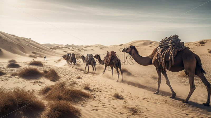 A lone camel caravan traversing a desolate desert landscape