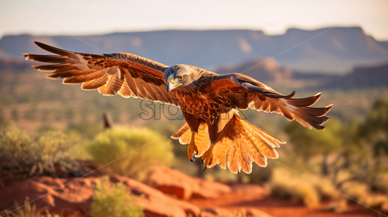 A majestic Harris’s hawk soaring above the arid desert landscape