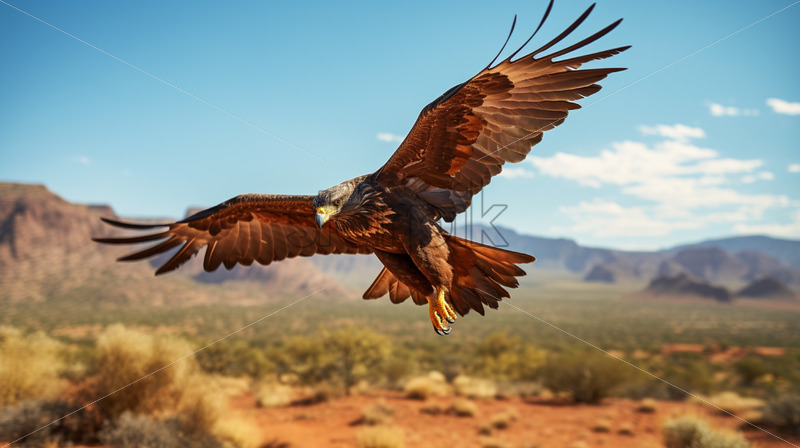 A majestic Harris’s hawk soaring above the arid desert landscape