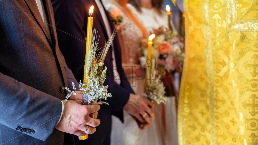 A man holds a candle, orthodox priest serving in a church. Wedding ceremony