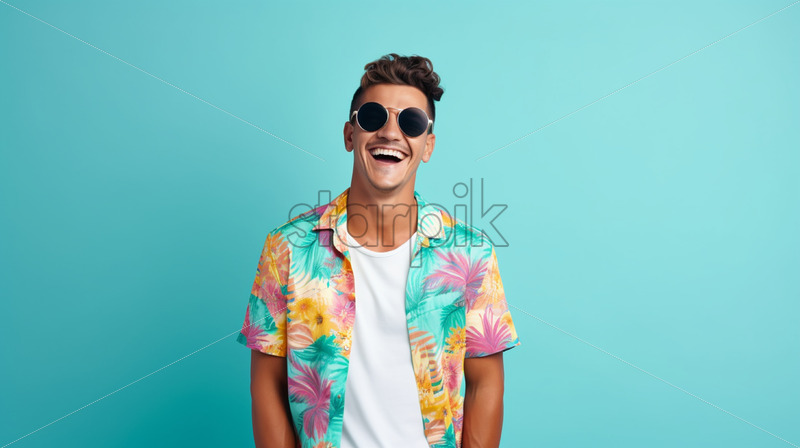 A man in colorful clothes on a blue background