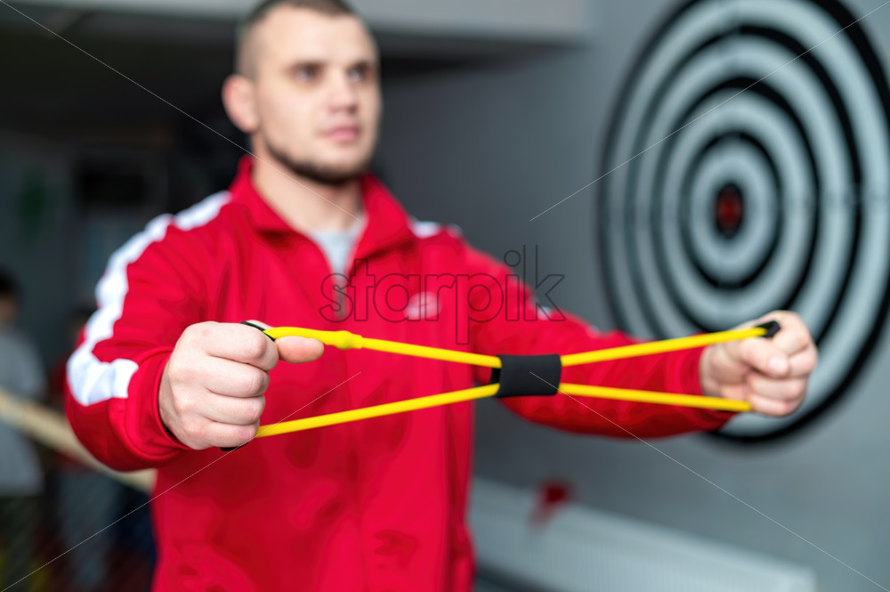 A man in red jacket is practicing with exercise equipment for hands in a gym