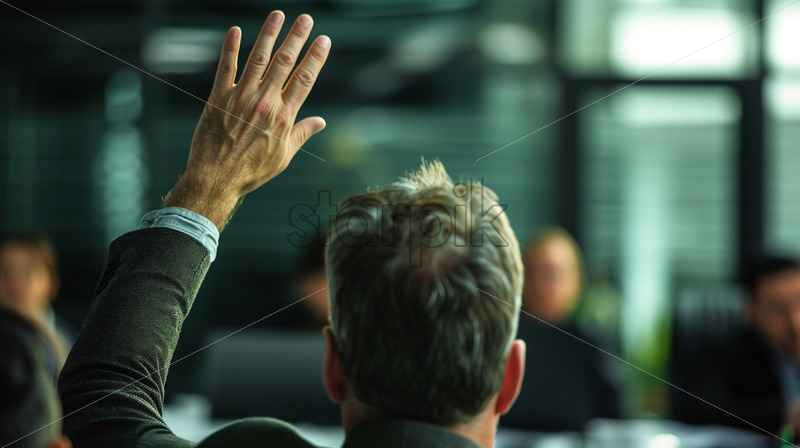 Caucasian mature man and woman at meeting table discussing a business plan with laptop computer in office. Workers on background Royalty Free Stock photo