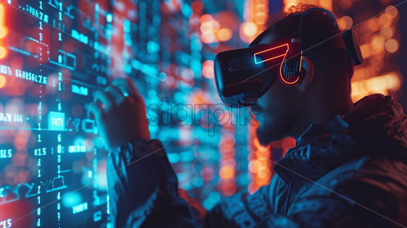holographic user interface being manipulated by a person in augmented reality glasses in front of a quantum computer
